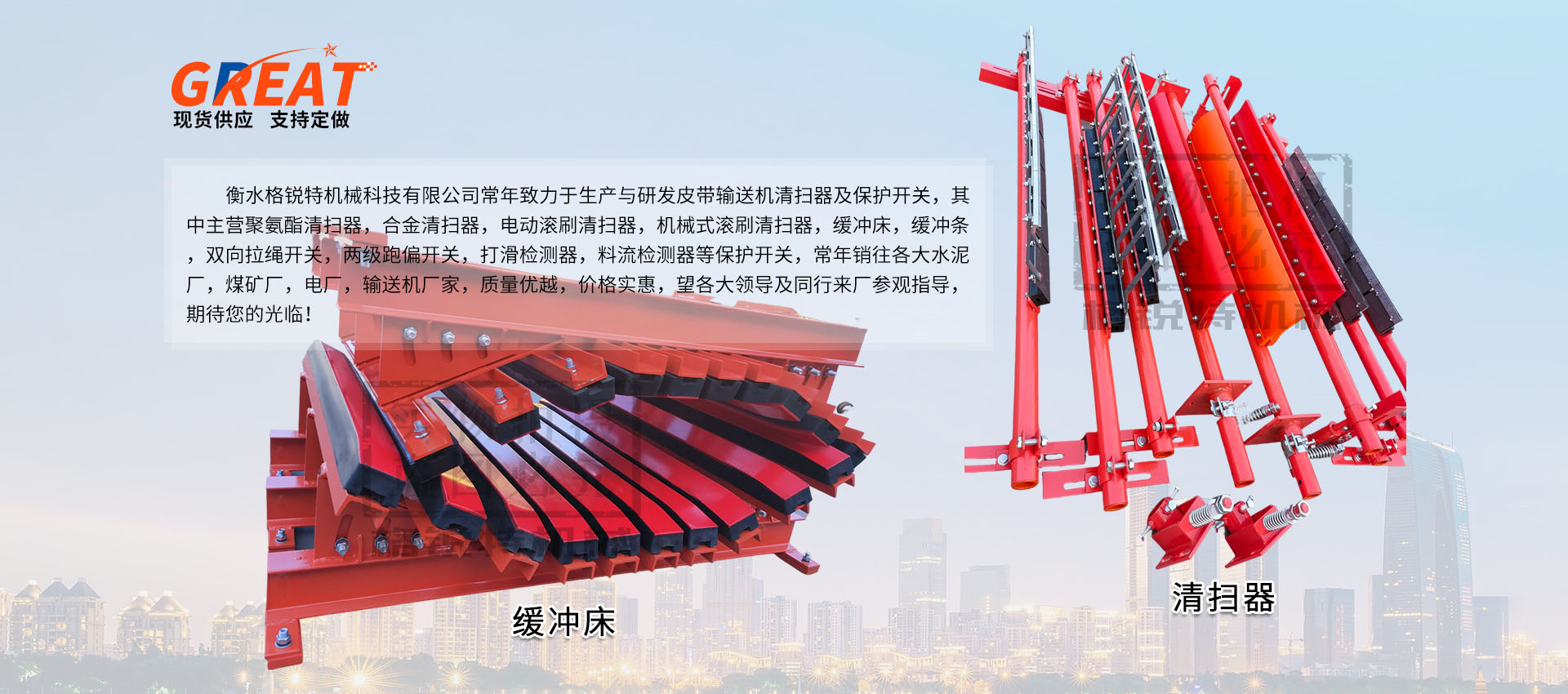 衡水格銳特機(jī)械科技有限公司常年致力于生產(chǎn)與研發(fā)皮帶輸送機(jī)清掃器及保護(hù)開關(guān),其中主營(yíng)聚氨酯清掃器,合金清掃器,電動(dòng)滾刷清掃器,機(jī)械式滾刷清掃器,緩沖床,緩沖條,雙向拉繩開關(guān),兩級(jí)跑偏開關(guān),打滑檢測(cè)器,料流檢測(cè)器等保護(hù)開關(guān),常年銷往各大水泥廠,煤礦廠,電廠,輸送機(jī)廠家,質(zhì)量?jī)?yōu)越,價(jià)格實(shí)惠,望各大領(lǐng)導(dǎo)及同行來(lái)廠參觀指導(dǎo),期待您的光臨?。?!
